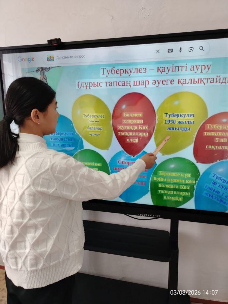 Бүгін мектебімізде туберкулездің алдын алу айлығы аясында бірқатар іс-шаралар ұйымдастырылды. Оқушылар арасында «Туберкулездің алдын алу» тақырыбында сынып сағаттары өткізілді. Сынып жетекшілері оқушыларға туберкулез ауруының таралу жолдары, белгілері және оның алдын алу шаралары туралы кеңінен түсіндірме жұмыстарын жүргізді.