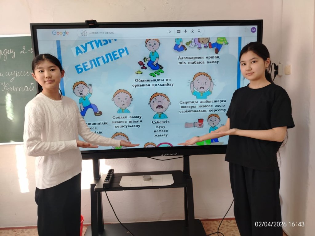 Бүгін жоспарға сай аутизм тақырыбы бойынша оқушыларға арнайы бейнеролик көрсетілді. Бейнеролик барысында «Аутизм деген не?» және «Аутизмнің белгілері қандай?» деген сұрақтарға кеңінен түсінік беріліп, оқушыларға пайдалы ақпараттар ұсынылды. Көрсетілімнің мақсаты – оқушылардың аутизм туралы білімдерін арттыру, ерекше балаларға деген түсіністік пен жанашырлық көзқарас қалыптастыру болды. Оқушылар бейнероликті қызығушылықпен тамашалап, өз ойларымен бөлісті.